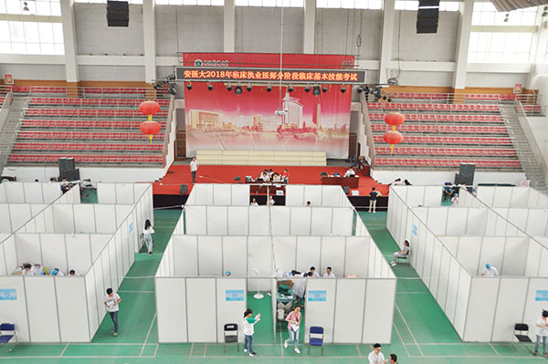考试分为医学基本知识考试(理论考试)和临床基本技能考试(技能考试)两部分。6月1日,理论考试分上午、下午两个单元,在人文医学学院进行机考,这也是我校首次举行成规模的医学综合计算机化考试。6月2日至3日,技能考试由第一附属医院牵头,在校体育馆和知行楼B同时设立两个考点,分9个考试组,每组六站同步进行,主要考查考生的病史采集、体格检查和基本操作技能,同时对沟通交流能力与人文关怀进行评价。