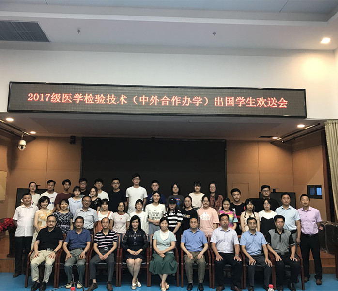 731日下午,第一临床医学院在知行楼一楼报告厅举行2017级医学检验技术(中外合作办学)专业出国欢送会,校长曹云霞出席欢送会并与即将出国留学的学生合影留念。