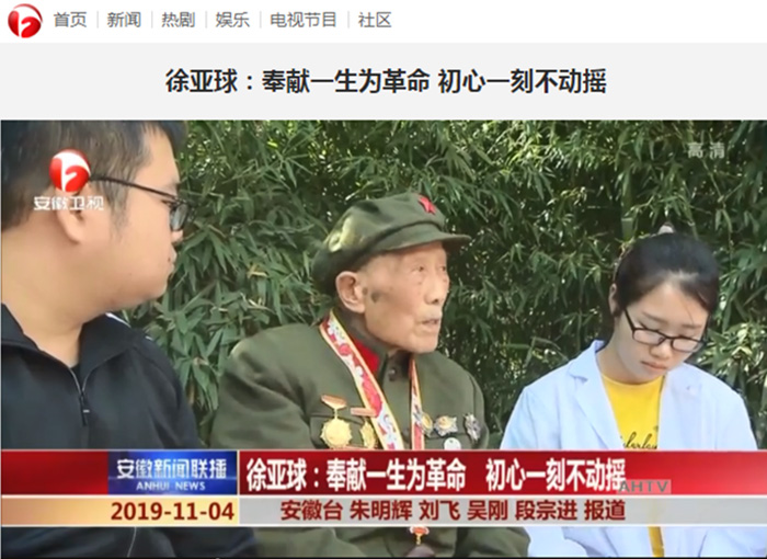 11月4日,安徽新闻联播以《奉献一生为革命,初心一刻不动摇》为题,对徐亚球老人的先进事迹进行了报道。记者现场采访了聆听微党课的青年学子,并来到老人的家中,进行了深入的采访。