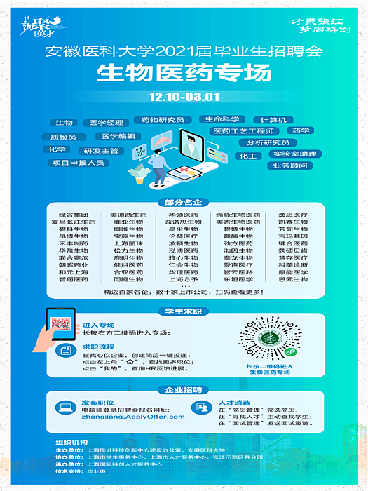 为进一步贯彻习近平总书记关于统筹做好高校毕业生就业工作的重要指示精神,落实党中央及省教育厅、学校关于就业工作的决策部署,扎实做好“六稳”工作、全面落实“六保”任务,进一步促进2021届毕业生毕业生顺利就业,我校联合上海市举办“87978797威尼斯2021届高校毕业生系列招聘活动(上海市——海聚英才:生物医药专场)”,现将有关事宜通知如下: