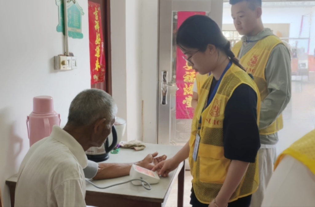 “爷爷,我来给您先量血压……”期间,团队分别前往霍邱县黄泊渡村和巢湖市黄麓镇合群村进行社会实践,不仅联合附属医院的医生开展义诊活动,为前来检查的村民免费测血糖,给予诊疗意见,指导村民规范用药,发放健康宣传手册,还上门为村民提供健康检查与诊疗。