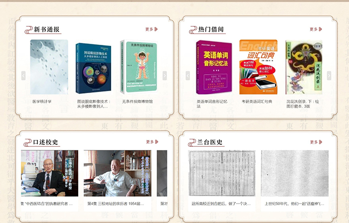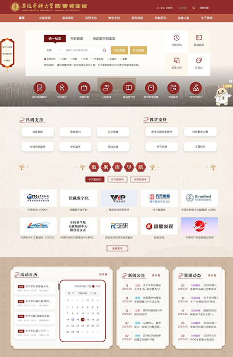 新门户首页整合“文献资源”“读者服务”“科研支持”“教学支持”“服务指南”“档案研究”“党建之家”“关于我馆”八大核心模块,并突出“一站式检索”与八个热门服务入口,切实提升师生使用体验。全新推出的“科研支持”与“教学支持”栏目,精准对接师生科研与教学需求,并新增多维度数据库导航系统,显著提升资源检索效率。此外,首页实时更新新闻公告、资源动态与活动日历,并设置“新书推荐”“热门借阅”“口述校史”“兰台医史”等内容板块,兼顾实用功能与文化传承,构建融合图书阅览与校史研究的新型服务界面。