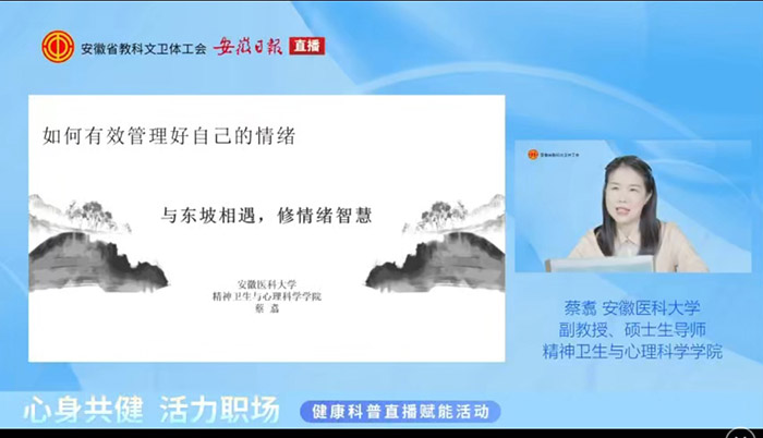 直播由校工会主席李群主持。首场活动以“心理赋能”为核心主题,特邀校精神卫生与心理科学学院两位专家坐镇直播间。学院院长朱春燕教授带来《与压力和解,同健康拥抱——职场压力的科学管理与调节》主题分享,结合其深耕精神心理领域多年的临床经验与科研成果,从压力的神经机制入手,系统讲解压力的科学认知方法,并提供“呼吸调节法”“认知重构”等可直接落地的压力调节技巧。副教授蔡翥以《与东坡相遇,修情绪智慧——如何有效管理自己的情绪》为题,创新融合传统文化与心理学理论,引导职工学会识别情绪信号,掌握“情绪暂停法”等即时调节工具。​